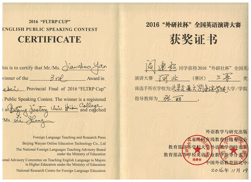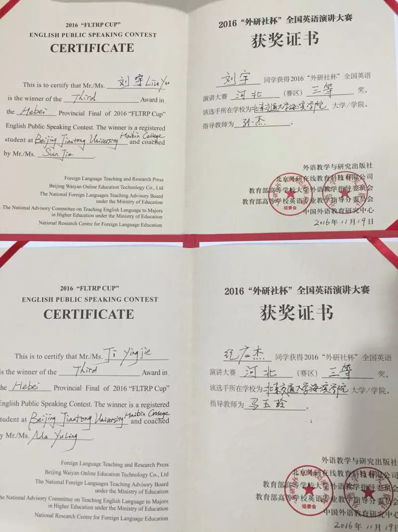 2016年11月18日—20日,河北省高等学校第十七届“世纪之星”英语演讲大赛在唐山师范学院举行,来自全省73所高校的481名参赛选手及其指导教师参加了比赛。经过两天的激烈角逐,最终,Beat365外语系教师宋琳琳荣获“青年教师组”二等奖,基础教学部大学英语教研室教师孙杰荣获“青年教师组”三等奖,交运系学生刘宇、计科系学生纪应杰、外语系学生闫建超荣获大赛三等奖,基础教学部大学英语教研室主任马玉玲荣获优秀指导教师奖。