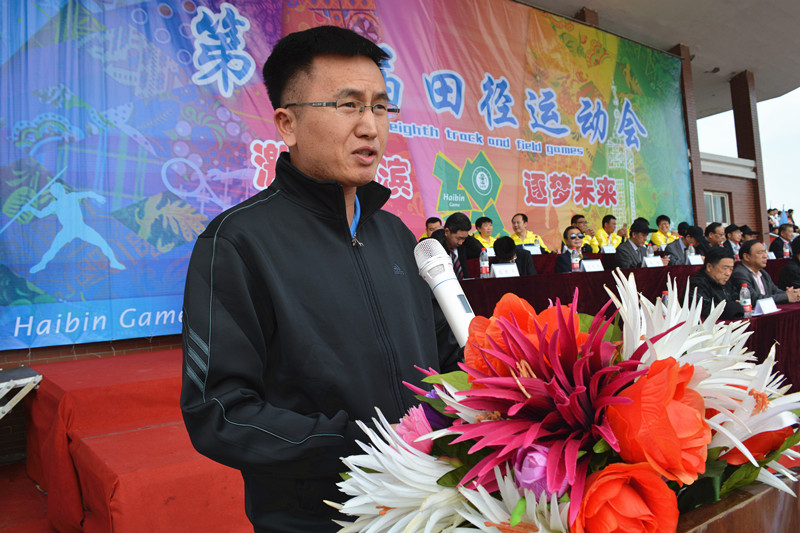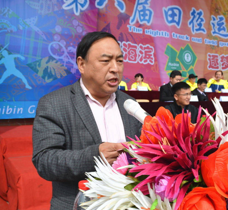 黄骅市副市长郑增强致辞,他首先代表中共黄骅市委、黄骅市人民政府对北京交通大学海滨学院第八届田径运动会的隆重开幕表示热烈的祝贺,并肯定了我院在体育基础设施建设和各类体育比赛中取得的优异成绩,希望海滨学院的全体师生员工能够热爱体育运动,养成健康的生活习惯,以更加饱满的热情投入到紧张的学习、工作和生活中去,在充满生机与活力的渤海之滨谱写更加精彩的人生篇章,为黄骅市社会体育文化活动的繁荣发展做出更大贡献。