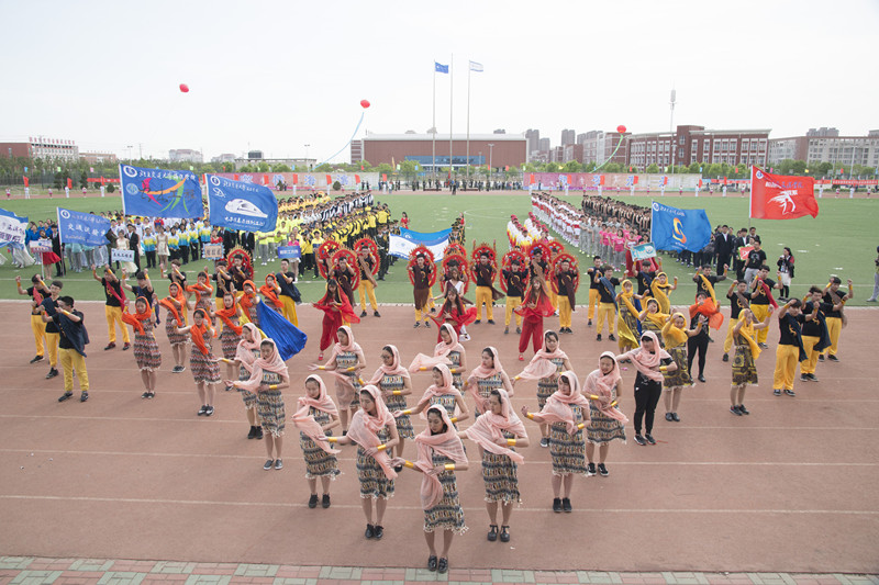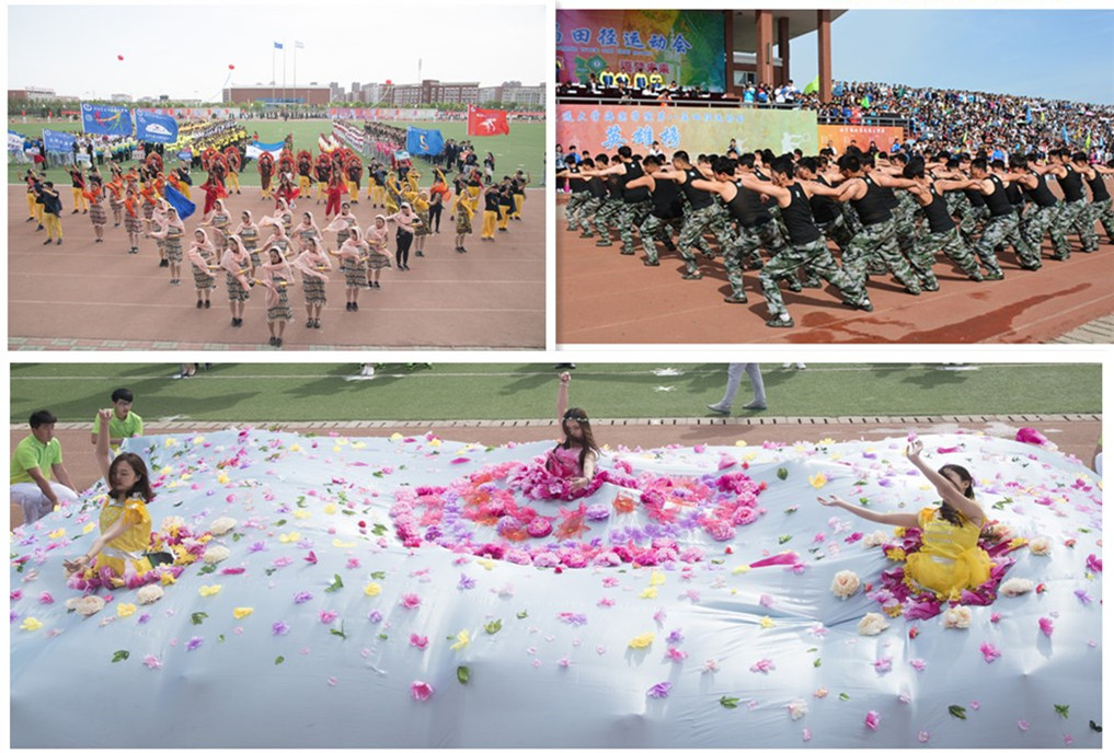 院领导和来宾与全院师生一同欣赏了独具海滨魅力的开幕式表演。表演分为金鼓齐鸣、五彩青春、梦之海洋三个部分。精彩的表演充分展现了海滨学子的青春活力和勃勃生机,这场饕餮盛宴引得全场观众掌声连连、欢呼不断。随后国旗班方阵、刀旗方阵、鲜花方阵、裁判员方阵和教职工方阵依次入场,九大系的系主任带领各系运动员代表队紧随教职工方阵入场,每个系的方阵都精心设计了服装、队形和表演内容,他们整齐划一的步伐、各具风格的表演展示了海滨学子昂扬向上的风采。