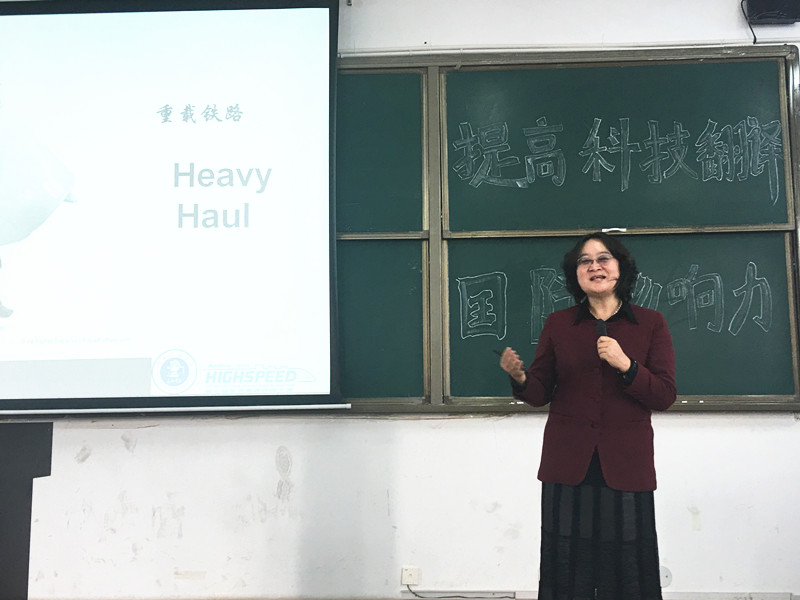 2016年3月23日,知行楼A201座无虚席,掌声阵阵。外语系主任张军学邀请中国铁道科学院主任翻译任化为外语系300多名师生举办了题为《提高科技翻译的国际影响力》的讲座。任化老师是铁道科学技术信息研究所副总工程师,国际标准化组织IEC术语专家委员,新任国际铁路联盟UIC中国总代表。她从事翻译工作近30年,多次在人民大会堂、钓鱼台国宾馆等重要场合为国家领导人及国际组织的领导人担任大会翻译,担任国务院、发改委、科技部、商务部、原铁道部领导出访翻译,英国驻华大使馆聘任轨道交通大会同声传译,美国总统访华代表团翻译,加拿大总理访华翻译等。