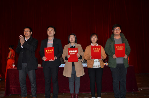 张乐乐副院长宣读了《关于表彰2015届毕业生就业工作先进集体及先进个人的决定》,对为我院2015届毕业生就业工作做出突出成绩的先进集体及先进个人给予表彰。王化深院长、张乐乐副院长、孙文博副书记为先进集体及先进个人颁奖。