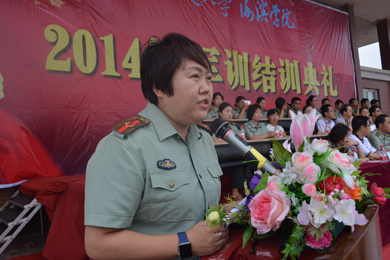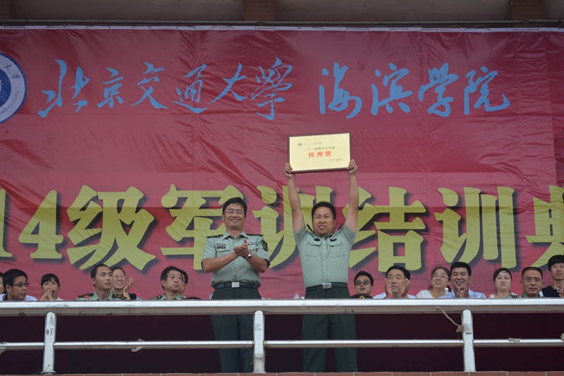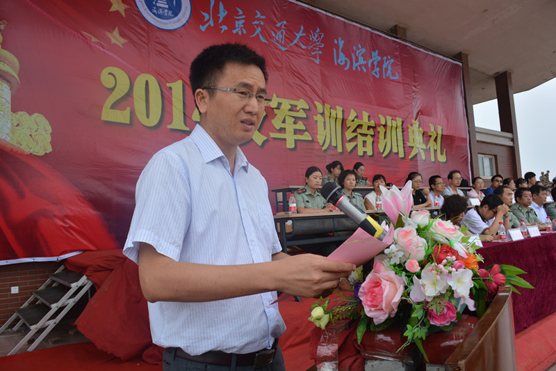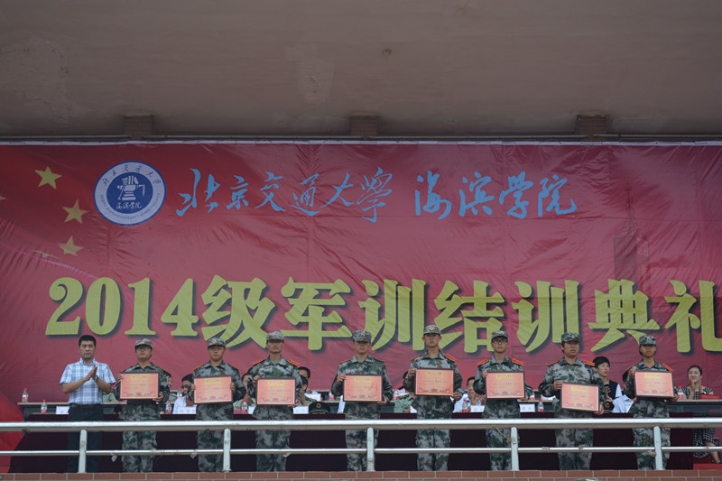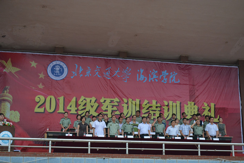 2015年7月16日早7点,我院举行了2014级军训结训典礼。黄骅市市委常委武装部部长庞玉发上校、黄骅市武装部政委李英上校、黄骅港边防检查站副站长史会彬中校,我院全体院领导,北京军区驻北京交通大学选拔培养办公室北京交通大学海滨学院军训团团长倪立萍中校,各系主任助理,各系团委书记,以及军训团各营长、教导员出席典礼。结训典礼由军训团政委、院团委书记黄璐璐主持。