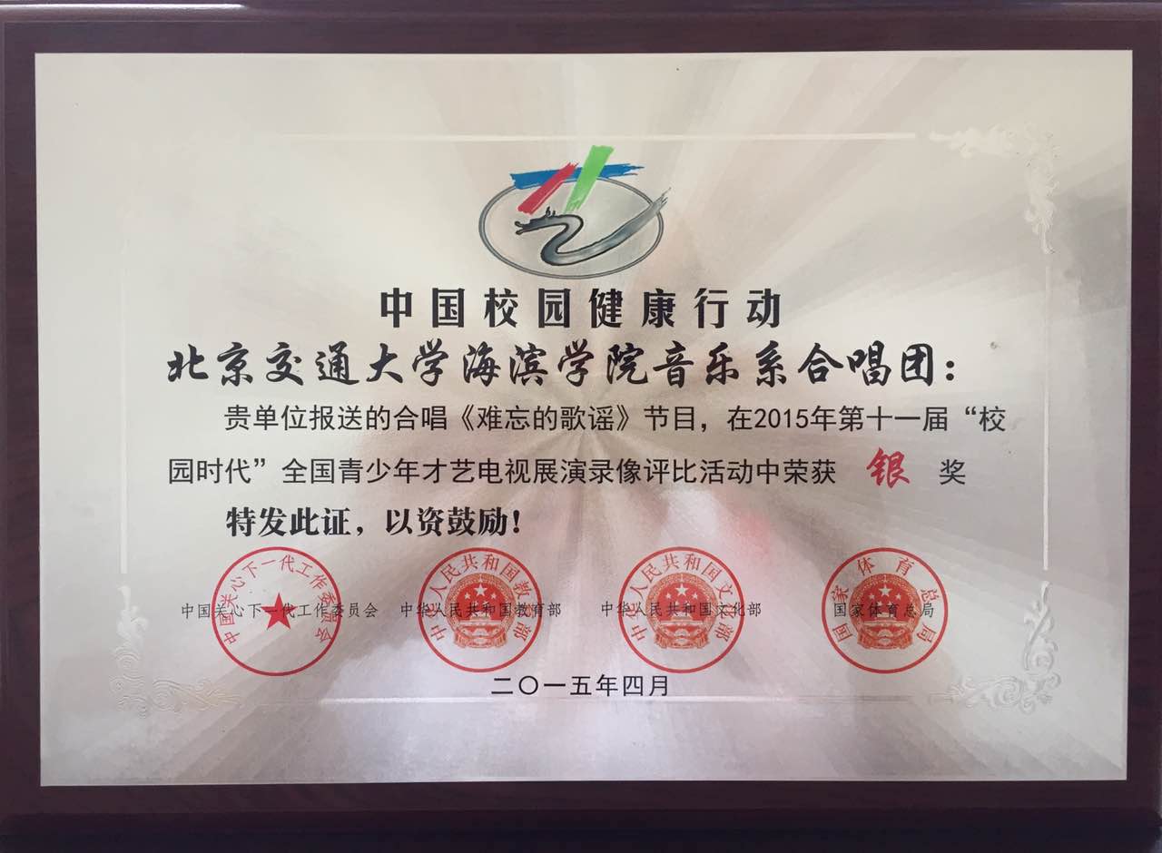 经过专家的认真评比,最终我院合唱团荣获第十一届“校园时代”全国青少年才艺电视展演节目征集、评选大学组银奖;党委副书记孙文博和杨浩藜老师、蔡海波教授荣获“优秀指导教师”称号;蔡海波教授作曲、指挥的《难忘的歌谣》荣获最佳音乐创作和指挥奖;执行院长王大勇荣获“先进工作者”称号。