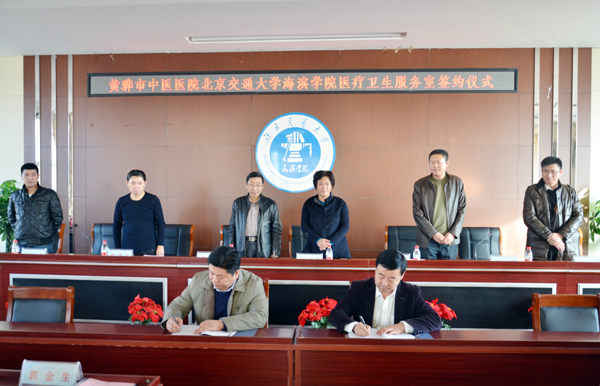 1月17日下午,黄骅市中医医院北京交通大学海滨学院医疗卫生服务室签约仪式在我院行政楼五楼会议室举行。北京交通大学党委副书记、我院院长高福廷,我院执行院长王大勇,黄骅市副市长夏爱华,市人力资源和社会保障局局长何国山、医疗保险基金管理中心主任杨寿岭,黄骅市中医医院院长刘忠虎、副院长郭金生等领导出席签约仪式。我院师生代表参加签约仪式。签约仪式由王大勇执行院长主持。