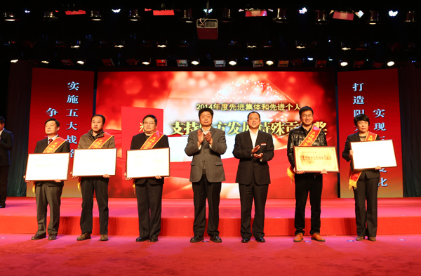 2月28日上午,黄骅市召开“园区项目突破年”“夯实基础性工作年”动员大会。市四套班子领导出席会议。大会回顾总结了全市2014年工作,对2014年度经济社会发展做出突出贡献的51项、609个先进集体和先进个人进行了表彰。