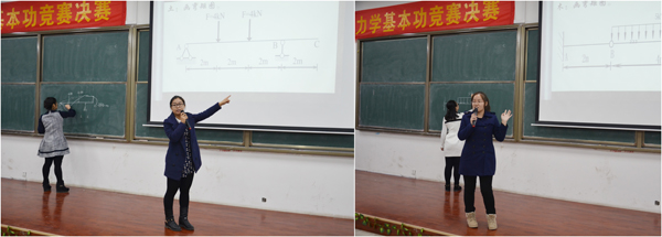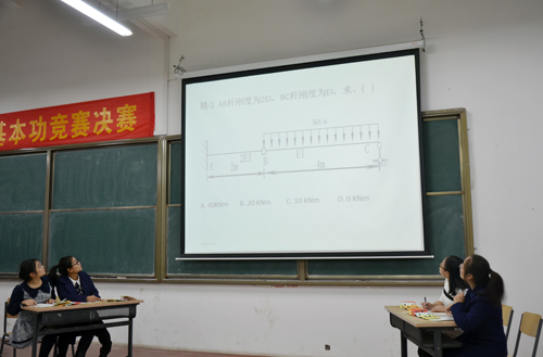 晋级决赛的8名选手经过抽签分成四组。决赛分为“谁与争锋”和“奇思妙想”两个环节。在“谁与争锋”环节,四组选手任选一道结构力学绘图解答题进行现场讲解,并回答评委老师的提问。四组选手凭借扎实的基本功、默契的配合,在规定15分钟的时间内,成功解题。经过激烈角逐,4名选手成功进入第二环节。在“奇思妙想”环节,选手们要完成16道结构力学选择题,每题限时30秒,4名选手沉着冷静、思维敏捷、反应迅速,精彩的表现赢得在场评委和观众的阵阵掌声。