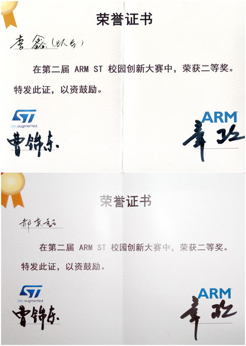 近日,第二届ARM ST校园创新大赛总决赛在上海举行。经过资格赛的信息确认和初赛的全方位评选,共有20支队伍从700多支参赛队伍中胜出入围总决赛。在机械与电气工程系赵超群老师的带领下,由电气工程及其自动化专业2012级学生李鑫和郝奕超组成的我院代表队参赛。最终,我院参赛作品《基于STM32F的无线遥控智能车》荣获二等奖。