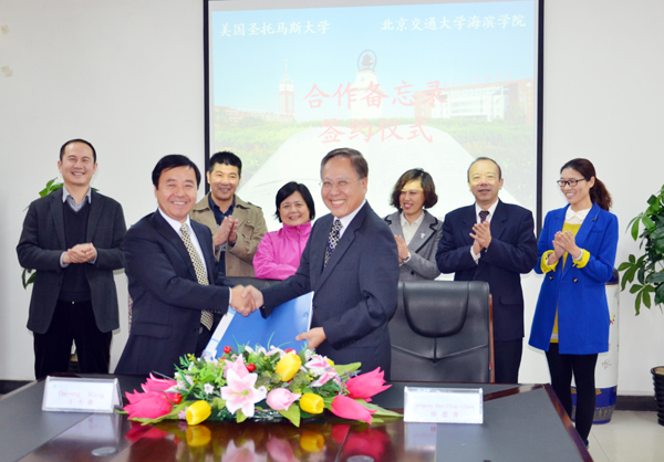 下午2:00,我院与美国圣托马斯大学国际合作项目洽谈会在行政楼二楼会议室举行。王大勇执行院长代表学院向陈思齐副校长及康继老师的到访表示热烈欢迎,并从办学模式、专业设置、师资结构、学生实习实训、毕业生考研与就业等方面介绍了我院的办学情况。陈思齐副校长对我院的热情接待表示衷心感谢,同时简要介绍了圣托马斯大学的基本情况。会上,围绕合作模式、培养计划、课程体系、学分互认、学习费用、学生奖助、短期交流、互派教师等校际合作事项,双方进行了深入探讨,并达成广泛共识。最后,王大勇执行院长与陈思齐副校长共同签订合作备忘录。