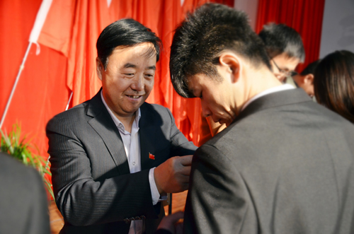 接着,院领导、党委委员为师生党员代表佩戴党员党徽,为学生党员宿舍颁发标牌。