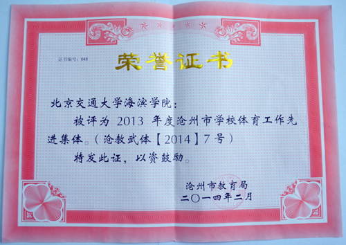 2月27日,沧州市教育局印发《关于表彰全市2013年度体育武术卫生国防教育工作先进集体和先进个人的通报》(沧教武体〔2014〕7号),我院被评为2013年度沧州市学校体育工作先进集体。
