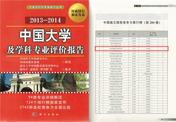 ◆1月16日,中国科学评价研究中心、中国科教评价网、武汉大学中国教育质量评价中心发布《2013-2014中国大学及学科专业评价报告》。我院又一次荣登全国独立学院排行榜第五名,成功入围全国独立学院前十强。