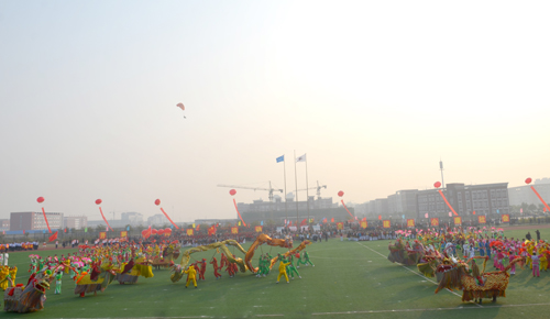 开幕式前,2000多名来自全市乡镇、社区、市直机关、企业、学校的各界群众进行了大型文体表演。文体表演分为龙腾奋飞、英姿流韵、青春飞扬、激情奋进和走向未来五个篇章。在走向未来部分,我院学生表演了大型团体操,她们踏着欢快的节拍、舞动青春的旋律,用手中的七彩雨伞呈现出“海滨缩写”“旋动风车”“奥运五环”“旭日东升”等图形图案,为全场观众带来了一幕幕震撼人心的视觉盛宴。