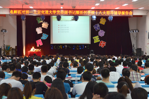 6月20日下午,北京交通大学党委副书记、纪委书记,思想政治教育专业博士生导师颜吾佴教授党的十八大精神辅导报告会在我院实验楼报告厅举行。我院执行院长王大勇,副院长兼党委副书记张长铎,副院长吴子成、周俞波、徐维祥及各相关单位负责人,教职工党员、学生党员参加报告会。报告会由王大勇执行院长主持。