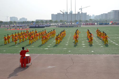 开幕式在一系列精彩的团体表演中拉开帷幕:热情奔放的安塞腰鼓、气势恢宏的刀旗、飘逸潇洒的太极扇、新奇独特的创意起步等大型表演,赢得全场观众阵阵掌声和喝彩声,不断将开幕式推向高潮。尤其是由女生们带来的大型团体操表演,更是为全场观众带来了一幕幕震撼人心的视觉盛宴,她们洋溢着灿烂的笑容、踏着欢快的节拍、舞动青春的旋律,用手中的七彩雨伞向我们呈现了“海滨缩写”“旋动风车”“奥运五环”等图形图案,令人赞不绝口、叹为观止。