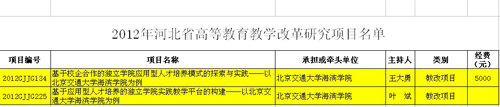 4月17日,河北省教育厅公布了通过审批的307项2012年河北省高等教育教学改革研究项目。我院王大勇执行院长主持的《基于校企合作的独立学院应用型人才培养模式的探索与实践——以北京交通大学海滨学院为例》和教务处处长叶斌教授主持的《基于应用型人才培养的独立学院实践教学平台的构建——以北京交通大学海滨学院为例》两项目顺利通过审批,成功立项,实现了我院省级教改项目“零”的突破。