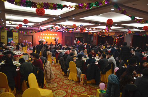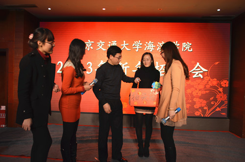 2012年12月27日晚,华悦凯旋大酒店四楼宴会厅张灯结彩、欢声笑语,处处洋溢着喜庆祥和的节日气氛,我院2013年新年招待会在这里隆重举行。沧州市政协副主席边老刚,黄骅市政府市长潘海瀛,黄骅市委常委、宣传部长程秀珍,黄骅市政府副市长郑增强,福建省福清市委常委、宣传部长、教育工委书记叶友琛,福清市政府副市长陈恒东,祥兴集团总裁、我院董事长薛行远,北京交通大学党委副书记、我院院长高福廷,原北京交通大学校长谈振辉等政府领导、投资方嘉宾、学院领导、专家教授和我院中层以上干部、优秀教职工代表100多人欢聚一堂,共贺新年。新年招待会由执行院长王大勇主持。