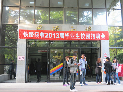 10月20日-21日,北京交通大学在思源西楼举办铁路接收2013届毕业生校园招聘会。我院执行院长王大勇、副院长贾怀义、招生就业处处长冯宝玺、招生就业处全体工作人员以及毕业班辅导员带领我院2013届300名同学赴北京交通大学参加铁路专场招聘会。