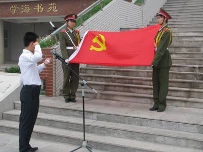 为迎接党的生日,庆祝中国共产党建党九十周年,弘扬爱国主义精神,2011年7月1日早7点,海滨学院在图书馆前举行了隆重的升国旗仪式。学院领导、老师、党员学生们共同参加了升旗仪式。
