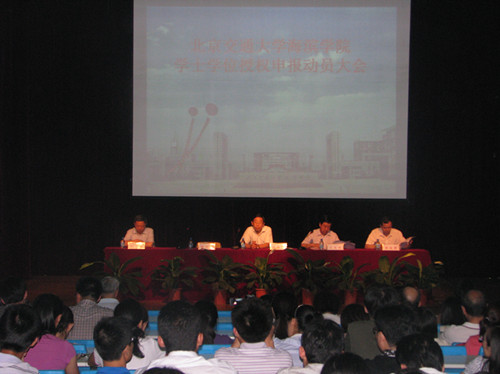 6月16日晚,我院“学士学位申报工作动员大会”在实验楼报告厅举行。北京交通大学党委副书记、我院院长高福廷,党委书记张平之,副院长吴子成、周俞波出席大会,全体教职工和部分学生代表参加了本次大会。会议由执行院长王大勇主持。