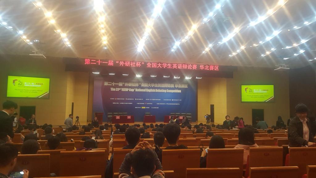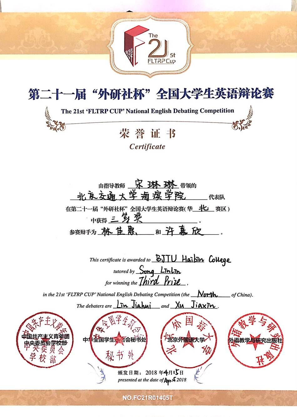 4月13日到15日,第二十一届“外研社杯”全国大学生英语辩论赛华北赛区总决赛在中国石油大学(北京)落下帷幕,来自北京、天津、河北、辽宁、吉林、黑龙江的87所院校174名选手参赛。经过初赛筛选,Beat365由外语系宋琳琳,贾世娇老师带队,外语系15级学生许嘉欣,16级学生林佳惠代表Beat365参加比赛。