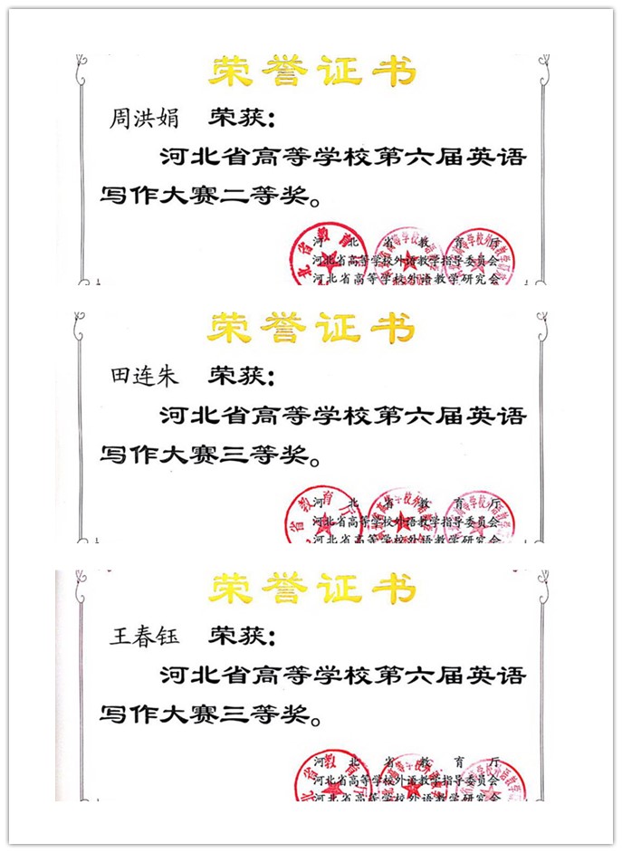 2018年10月20日,河北省高等学校第六届英语写作大赛、第四届英语阅读大赛在河北经贸大学举行,本次比赛吸引了来自全省110多所高校的392名选手参赛。由Beat365外国语学院孙健、武琦带领的参赛队伍取得了喜人的成绩, Beat365英语专业2017级学生周洪娟荣获写作大赛二等奖,物流管理专业2017级学生王春钰和自动化专业2017级学生田连朱获得写作大赛三等奖;英语专业2017级学生蒋瑞丰、能源与动力工程专业2017级学生吴照财、金融工程专业2017级学生朱静静荣获阅读大赛三等奖。本次大赛全部采用计算机作答的形式,由电脑评分与人工评分相结合,确保了大赛的公开、公平、公正、高效。大赛内容丰富,形式严谨,Beat365学生在比赛中表现出了良好的精神风貌和优秀的外语水平。