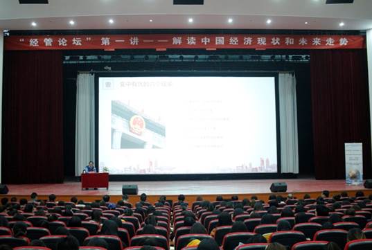 为加强Beat365经济管理学院学生对中国经济形势的了解,提高学生在经济、金融领域的学习认知程度,3月28日下午,Beat365经济管理学院主办,金融工程专业承办的 “经管论坛”系列讲座活动在天佑会堂顺利举行。本次论坛邀请到黄骅市政协主席(原黄骅市常务副市长)贾兆德担任主讲人,做了以“解读中国经济状况与未来走势”为主题的指导讲座。经济管理学院全体教师、1000多名学生和部分企业家代表参加了本次讲座。讲座由金融工程专业负责人周强教授主持。