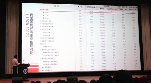 首先,王化深校长向在场师生阐明了新中国成立以来我国的三大发展阶段,并通过分析1978-2017年我国国民经济主要指标对比及经济增长对世界贡献率的比较等数据,让师生更加直观、客观地体会到中国现代化进程的飞速发展。