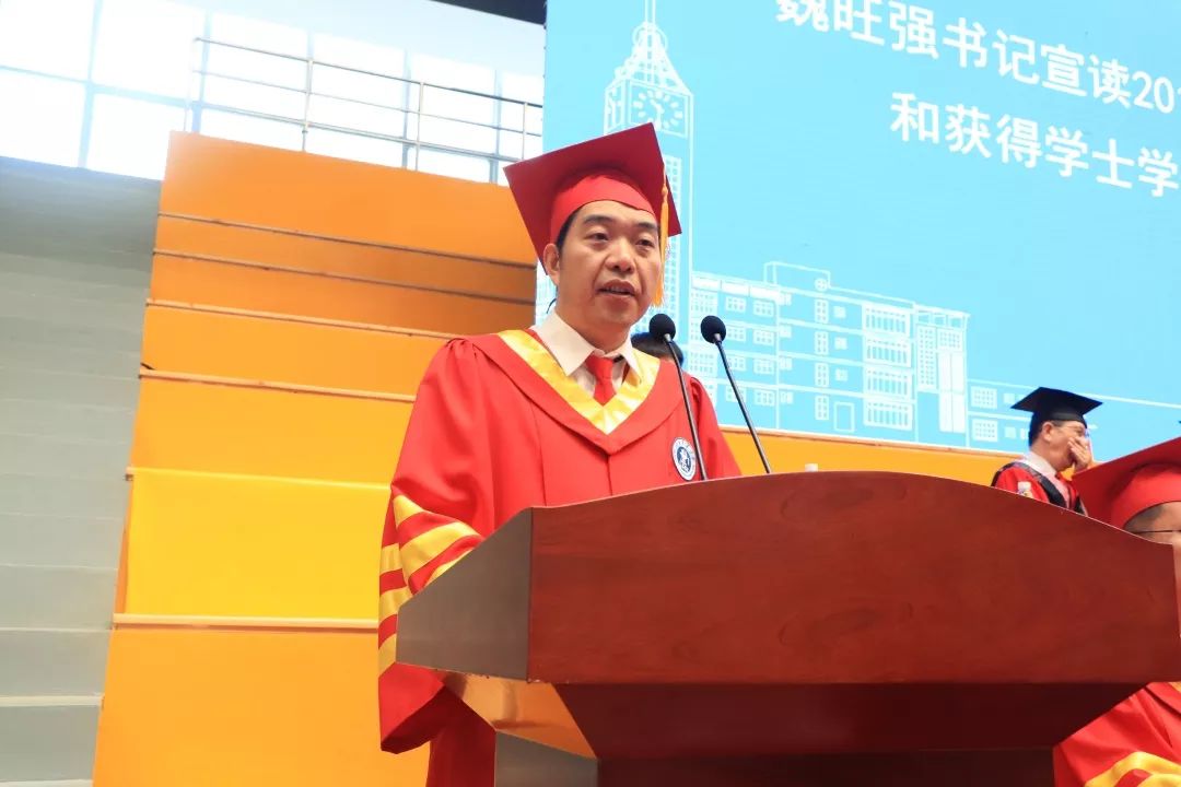 党委书记魏旺强宣读毕业生名单、获得学士学位名单。