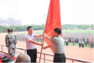 党委副书记魏炜为2018级军训团授旗,军训团团长倪立萍接旗。