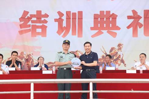 党委书记魏旺强为2018级军训团团长倪立萍上校颁发特别贡献奖