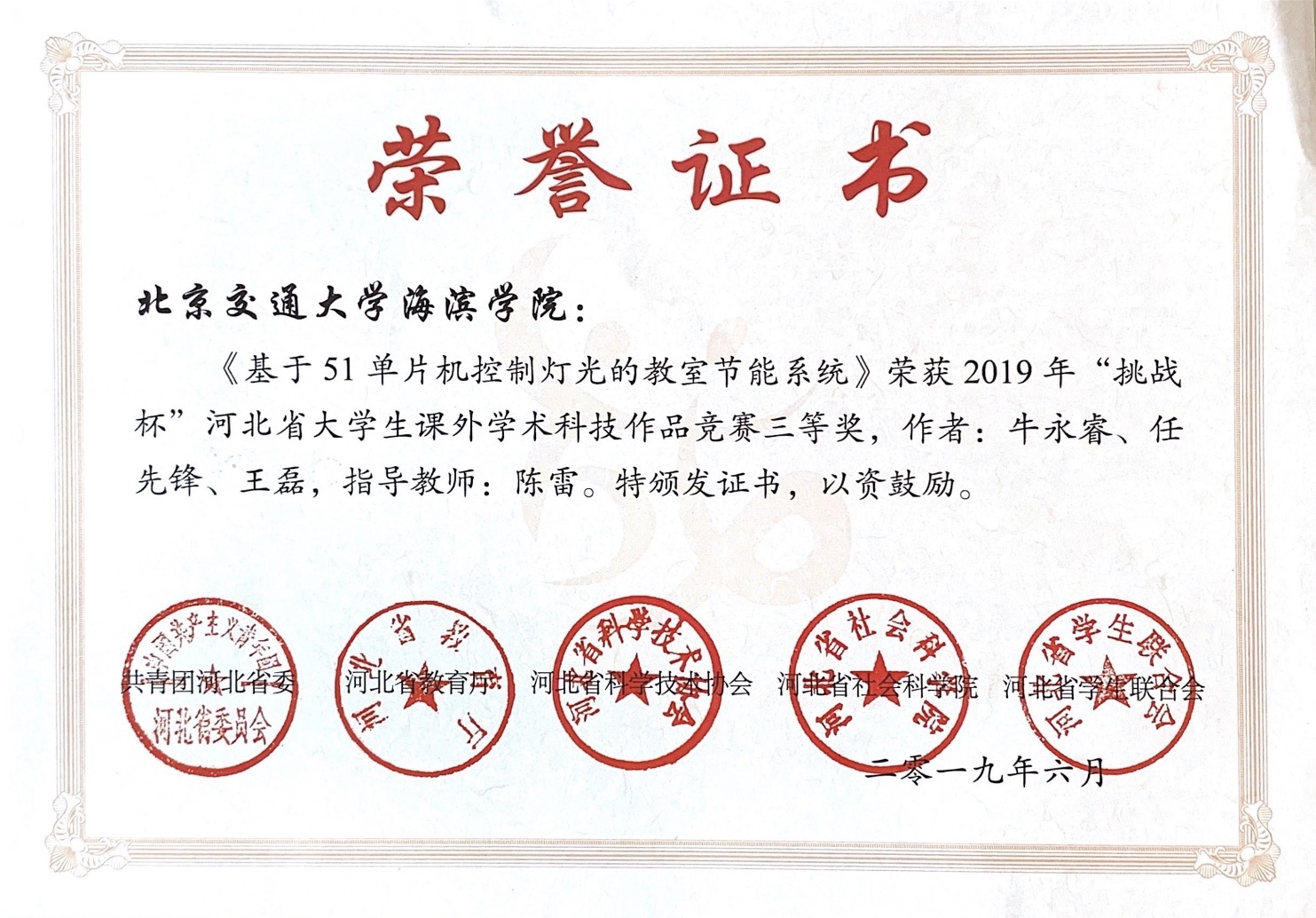 Beat365大学物理教研室教师陈雷指导电子与电气工程学院学生牛永睿、任先锋和计算机与信息技术学院学生王磊创作的《基于51单片机控制灯光的教室节能系统》,在2019年“挑战杯”河北省大学生课外学术科技作品竞赛中荣获三等奖。