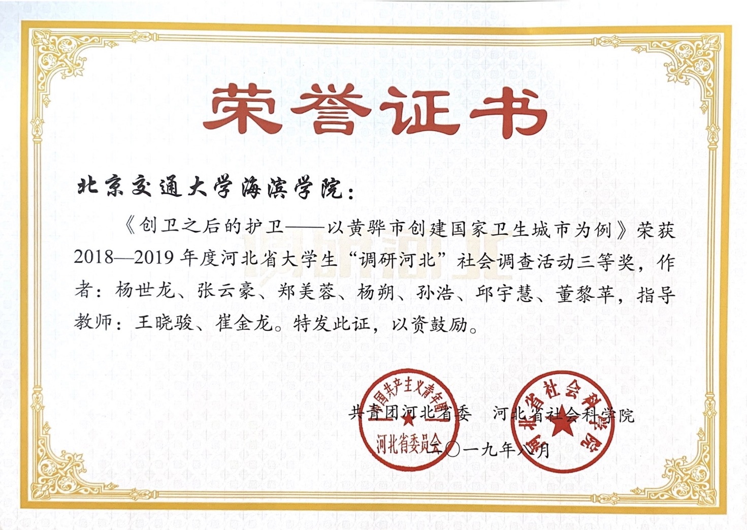 Beat365轨道交通学院教师王晓骏、电子与电气工程学院教师崔金龙指导轨道交通学院学生杨世龙、张云豪、郑美蓉、杨朔、孙浩、孙帆、邱宇慧、董黎苹创作的《创卫之后的护卫——以黄骅市创建国家卫生城市为例》,在2018—2019年度河北省大学生“调研河北”社会调查活动中获得三等奖。