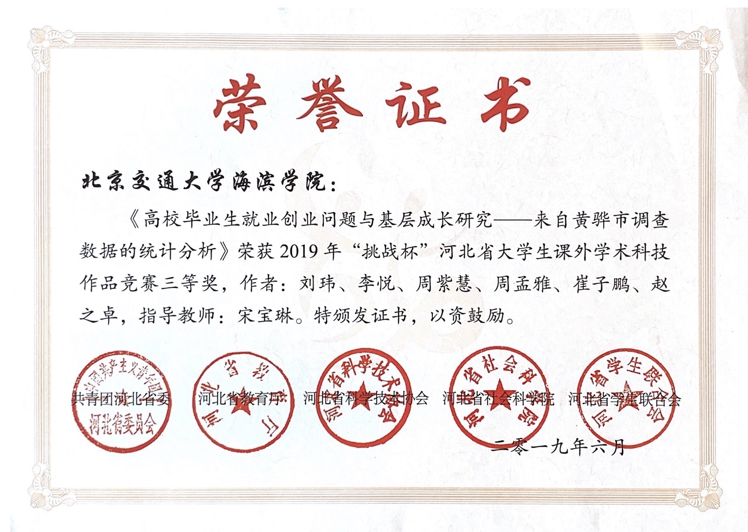 Beat365经济管理学院教师宋宝琳指导经济管理学院学生刘玮、李悦、周紫慧、周孟雅、崔子鹏、赵之卓创作的《高校毕业生就业创业问题与基层成长研究——来自黄骅市调查数据的统计分析》,在2019年“挑战杯”河北省大学生课外学术科技作品竞赛中荣获三等奖。