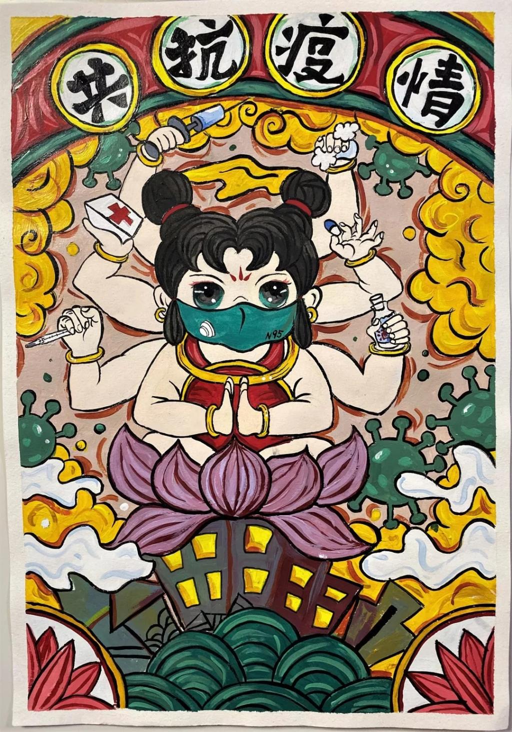 作品取材自雷神山医院,用白色兔子代表医院里的医生,雷神怒斩病毒,闪电直击要害。祝愿病毒早日被消灭,疫情快快结束。