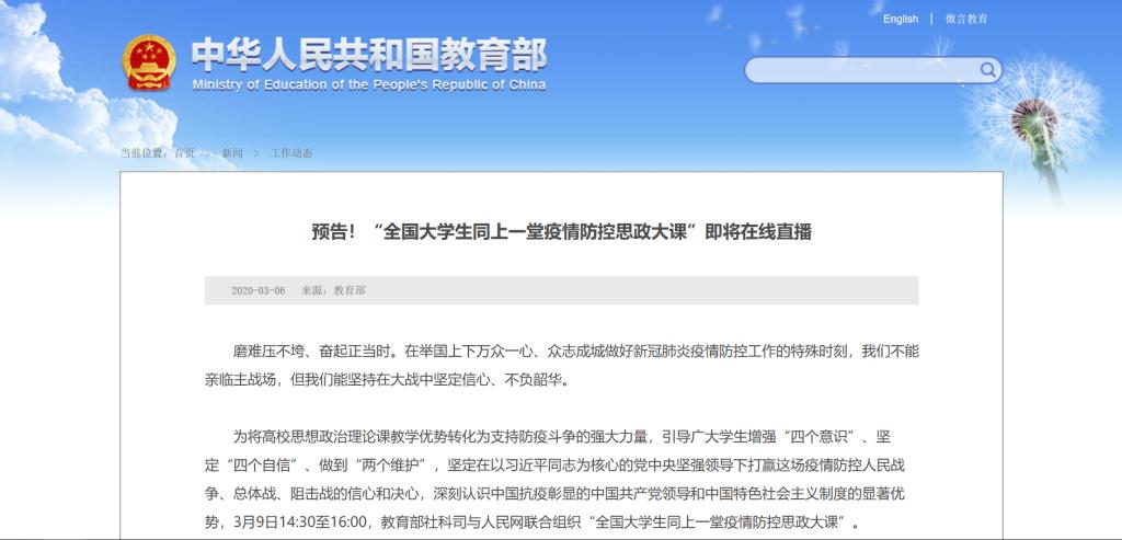 教育部官方网站发布“全国大学生同上一堂疫情防控思政大课”即将在线直播预告:3月9日14:30至16:00,教育部社会科学司与人民网联合组织“全国大学生同上一堂疫情防控思政大课”,欢迎关注。
