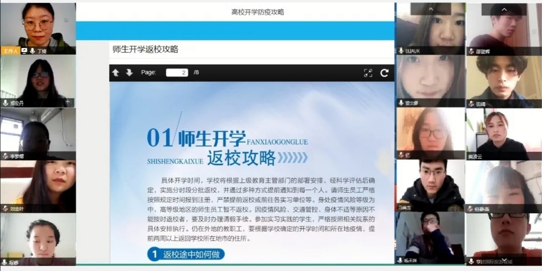 本次线上防疫培训活动分为学院教职工培训和学生培训两大部分。教职工培训主要针对开学前后老师们要做的准备工作和各种注意事项进行详细讲解;学生培训主要由辅导员老师组织学生干部进行防疫培训、新生班主任组织防疫培训班会、老生自行组织防疫培训班会三种形式,对同学们返校前学习攻略、网课学习攻略、居家安全等方面进行培训。