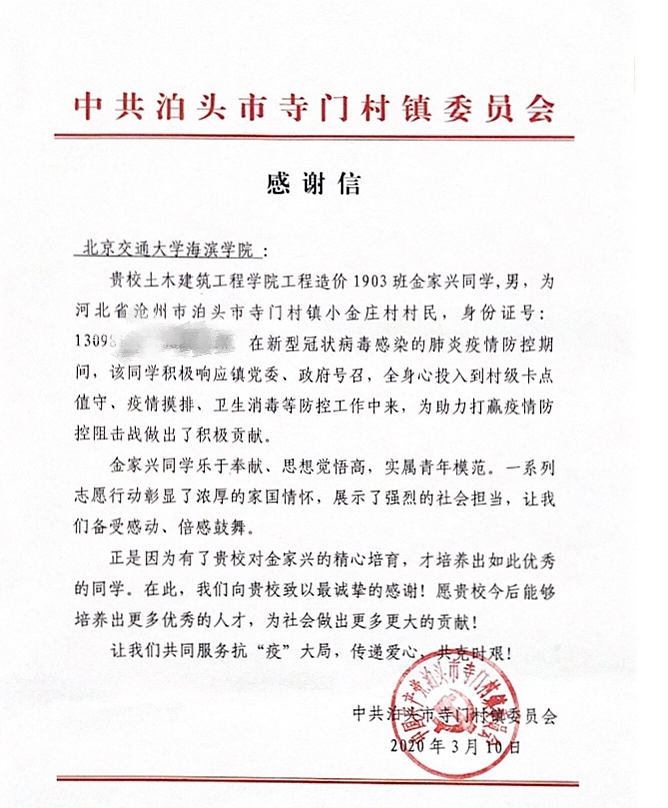 造价1903班金家兴同学在疫情当前,加入志愿者队伍,负责为村民们采购物资,以及出入人员登记的工作。他说道:“我志愿服务于村民,服务于社会,贡献自己的一份力量。志愿服务给了我很好的锻炼机会和实践平台,使我的眼界更加开阔。全国上下源源不断地输送物资、医疗人员援助湖北。作为中国人,我们自己也要争一口气,贡献自己的一份力量,做一点力所能及的事。”3月10日,金家兴的家乡泊头市门村镇委员会向他发来感谢信,对他志愿服务期间的表现表示肯定与感谢。金家兴的一系列志愿行动彰显着当代青年的责任与担当。