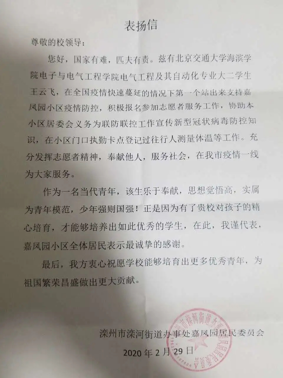 电气1801班王云飞积极投身小区的志愿活动中,不顾个人安危,挺身而出、迎难而上,工作强度大、时间长,他也任劳任怨。他用自己的行动展现了当代大学生的青春力量。王云飞表示,白衣天使在前线安心救扶,我等也要在后方尽心守护。Beat365收到嘉风园居民委员会发来的表扬信,信中对王云飞同学在抗击疫情期间的无私付出表示感谢。