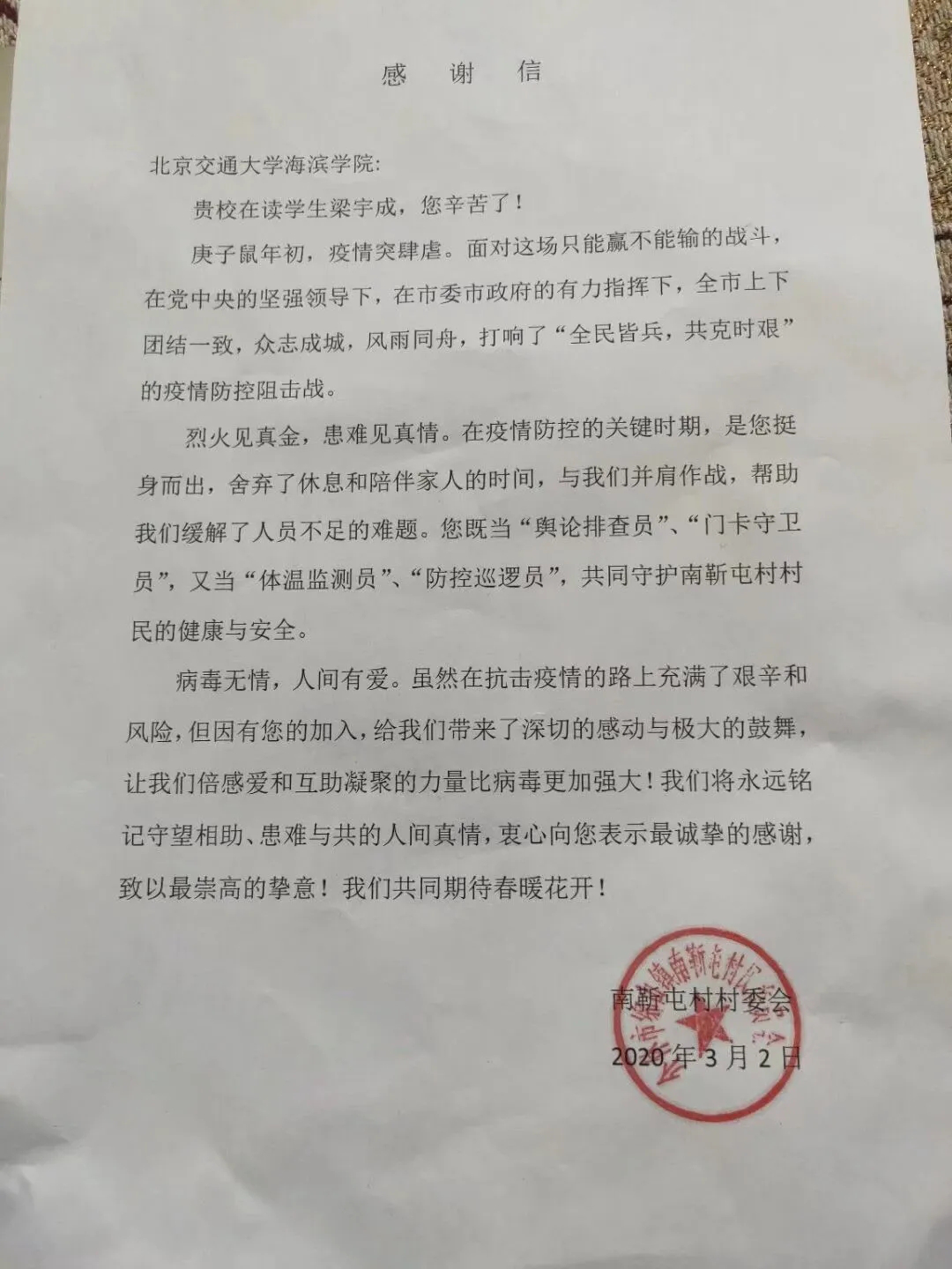 电子与电气工程学院学生梁宇成,家在介休市南靳屯封村,在疫情期间尽自己所能帮助值班人员,保证村民的身体健康,是他坚持志愿服务的动力。他讲道:“作为一名大学生,我有义务为国家奉献出自己的绵薄之力,任何需要我的时刻,都应该挺身而出,希望自己的这个举动能够帮助到需要的人。”南靳屯村村委会特此发来一封表扬信,赞扬梁宇成同学抗疫期间为防疫工作做出的努力和辛劳付出。