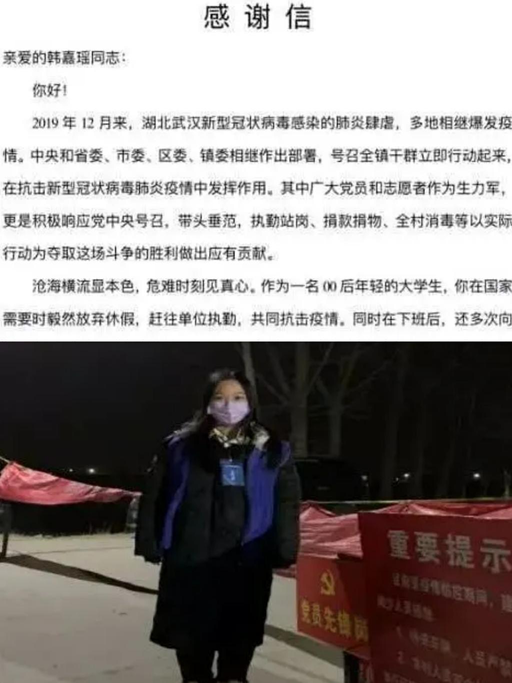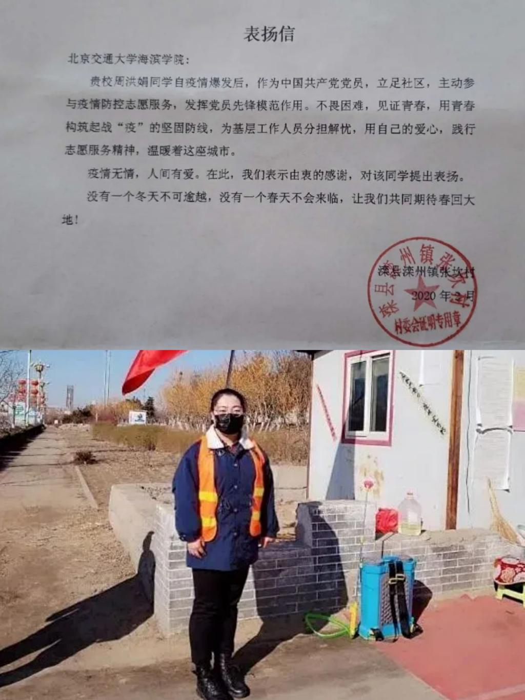 英语1701班周洪娟同学作为一名大学生党员,在党和国家需要她的时候,积极主动投入到疫情防控工作中。在父亲的带动下,她积极参加志愿服务工作,成为一名社区青年志愿者,为战胜新型冠状病毒贡献绵薄之力。张坎村居委会特此发来感谢信,信中对周红娟同学发扬党员先锋模范作用、不畏困难、践行志愿服务精神提出表扬。