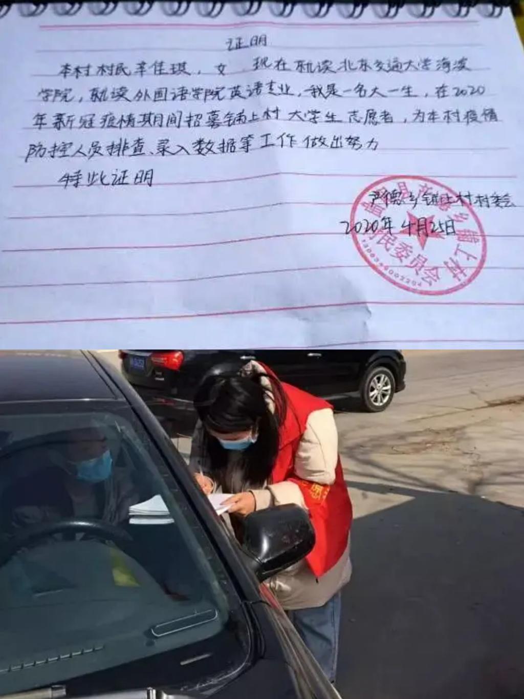 英语1901班辛佳琪在疫情期间,志愿加入当地志愿者,在疫情期间主要负责整理各家各户的身份信息,及时上报村里每家每户身体健康情况等工作。她讲道:“这次工作既锻炼了自己,也服务了村民,感受到了村民们的团结一心,相信在全国人民的共同努力下,我们一定会渡过难关。”