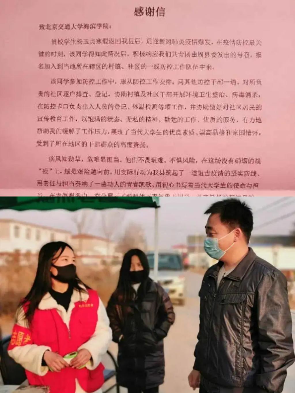 英语1802班李旭阳同学在疫情中,负责每天阻止来往人员流通、进行体温测量与记录、前往各家各户对外地来往人员进行登记与记录、宣传防控疫情知识,为疫情防控工作尽心尽力。她说:“我没有专业的知识,不能前往一线,不能“上战场”,但是我可以在自己的家乡为疫情防控攻坚战做出自己的一份贡献,防止疫情的扩散与蔓延。"北庄村村委会对李旭阳同学积极争做抗疫志愿者、参与值班执勤的优秀表现表示感谢。