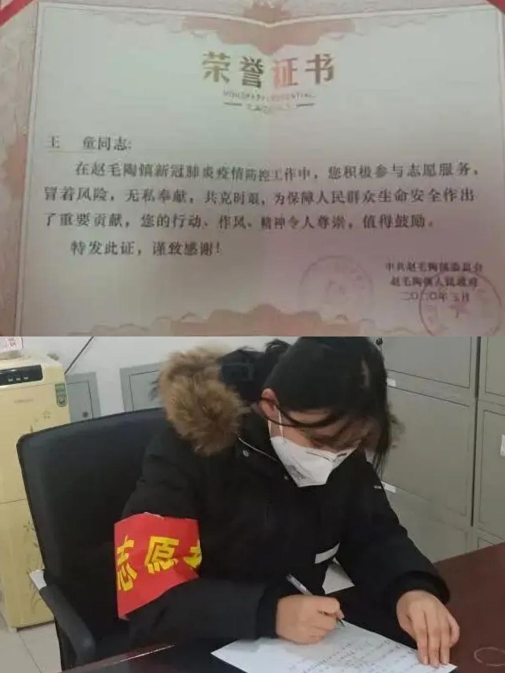 因为从小受到的教育,商务英语1802班王童同学在疫情期间为保证村民的安全,自愿和几名志愿者一起对村口岗位进行24小时轮班值守。此次战“疫”志愿活动,更加坚定了王童的目标:努力做一个有爱心、有决心、有志愿心的中国人。赵毛陶镇人民政府对王童同学在疫情防控工作中做出的贡献谨致感谢,特发荣誉证书。