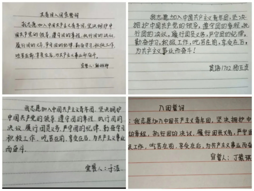 在民族危亡的历史关头,是青年学生挺身而出,以命相搏,在挽救国家命运的同时,以青春的热血赋予五四特殊的光辉。外国语学院学生手写入团誓词,唤醒每一位共青团员的意识,明确青年学生作为国家栋梁的义务和职责所在。