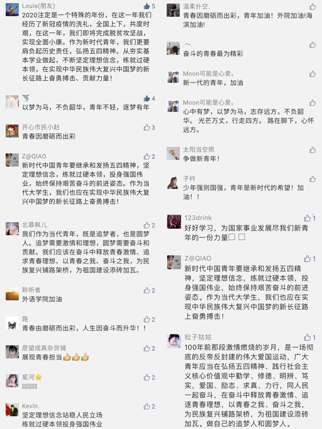 外国语学院官方微信平台推出“学习寄语精神 展现青春担当”主题系列活动后,学院各团支部迅速掀起学习热潮,积极在留言区留下学习感想,反响强烈。各位共青团员意识到作为当代青年,要勇担重任,不负使命,坚定理想信念,树立远大理想,踏实做好每一件事,不断锤炼、不断提高自己。