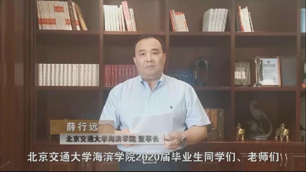 北京交通大学海滨学院董事长薛行远表示十分高兴和荣幸与同学们一起分享毕业的喜悦,并向2020届毕业生致以最热烈的祝贺和最诚挚的祝福。此时的中国,正处于实现中华民族伟大复兴中国梦的关键时期,作为海滨学院的毕业生,作为新时代的“后浪”,大家承载着学校的嘱托和父母老师的期望,担负着国家和民族赋予的时代使命。在人生的新起点,薛董事长送给2020届毕业生四句话:一,始终怀揣远大志向,拥抱未来,坚定理想;二,始终高扬奋斗旗帜,无论顺逆,都不熄灭向上向前的冲劲和斗志;三,始终脚踏实地,不断提升干事之能,下好务实之功;四,始终敬畏生命,热爱生活,无论处境如何,都要勇敢坚定过好每一天,努力活出生命之精彩。