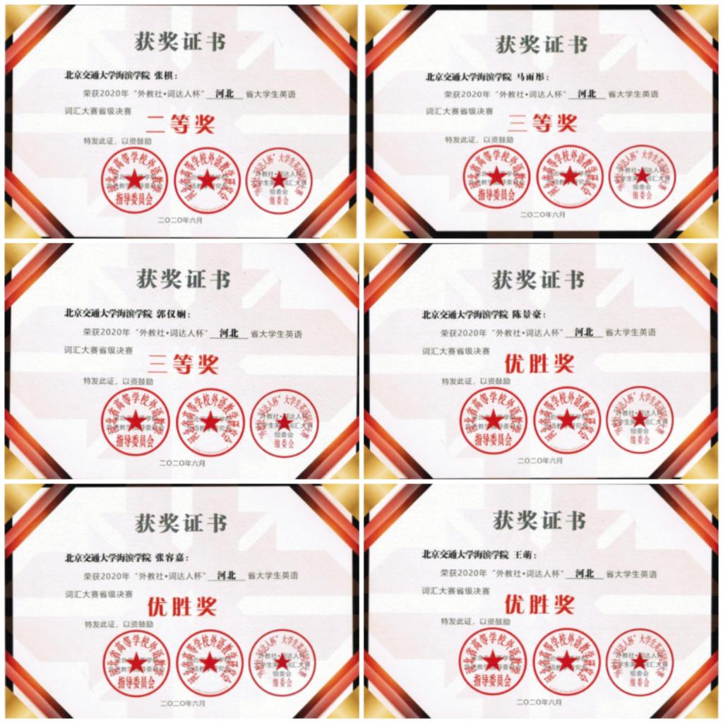 近日,河北省高校“外教社•词达人杯”大学生英语词汇大赛决赛圆满落下帷幕,Beat36520名学生与来自全省48所高等院校的940名选手进行了激烈角逐,最终获得二等奖1项、三等奖2项、优胜奖3项的优秀成绩。