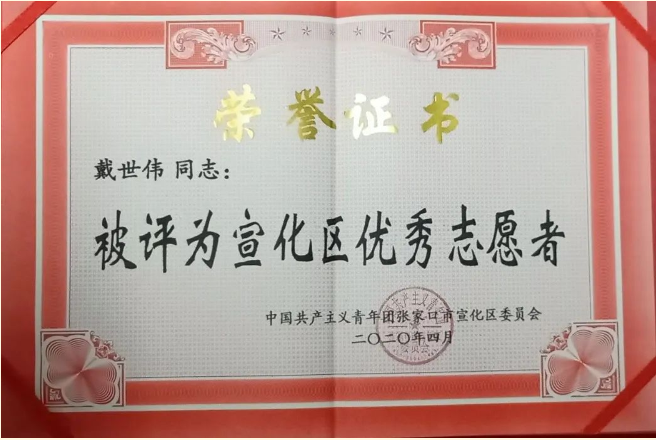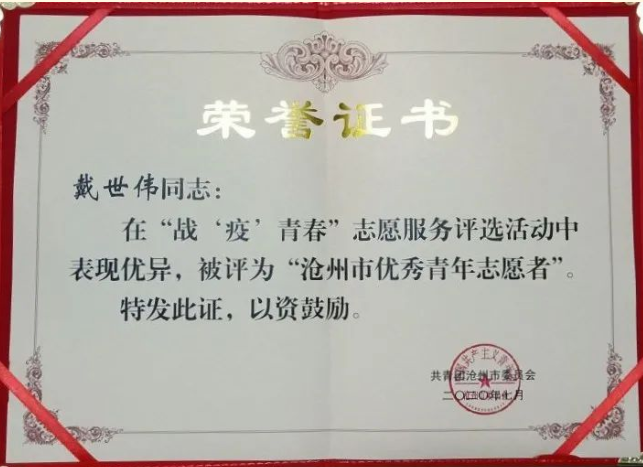 为弘扬和培育“奉献、友爱、互助、进步”的志愿精神,表彰在抗击疫情期间做出突出贡献的优秀志愿者,共青团沧州市委员会在全市范围内开展“战‘疫’青春”志愿服务先进典型评选活动。Beat365土木建筑工程学院工程造价专业1802班学生戴世伟被授予“沧州市优秀青年志愿者”荣誉称号。