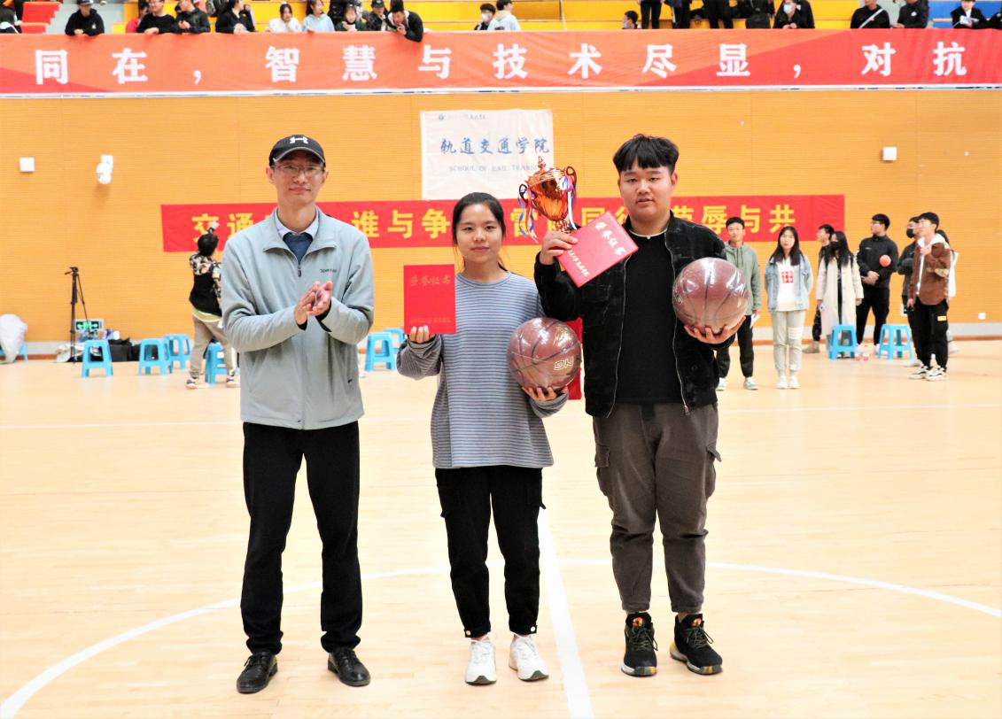 经过激烈的角逐,轨道交通学院与电子电气工程学院最终比分定格在39:37,轨道交通学院获得第十三届新生杯篮球赛的冠军。颁奖嘉宾们为获奖学院代表队员进行颁奖。
