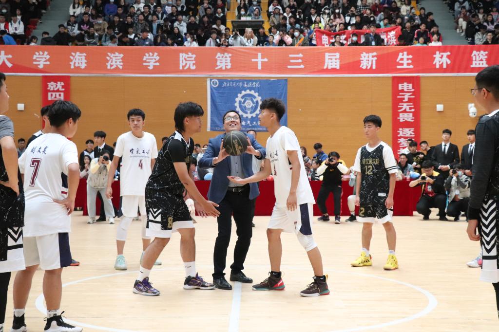 校长助理吴立军为比赛开局发球,宣告此次篮球赛正式开始。